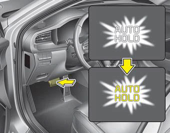 2. Когда вы полностью останавливаете автомобиль нажатием на тормоз педаль, индикатор AUTO HOLD меняется с белого на зеленый.