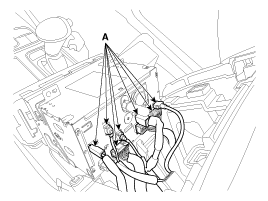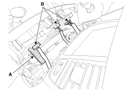 Снимите автомобильный шланг (А) и отсоедините разъемы (В) от блока управления отопителем и кондиционером.