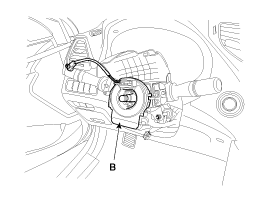 Отсоедините разъем модуля подушки безопасности (А) и разъем звукового сигнала (В), затем снимите модуль подушки безопасности с рулевого колеса.