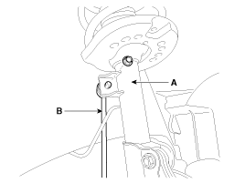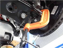 Отсоедините стойку стабилизатора (В) от передней стойки в сборе (А) после ослабления гайки.