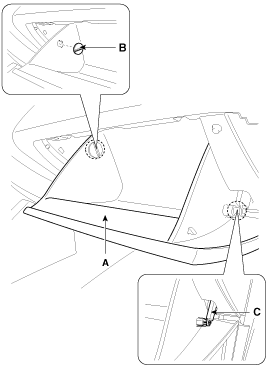 Отсоедините демпфер (В) от перчаточного ящика (А), затем снимите подъемник перчаточного ящика (С).