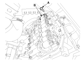 Снимите жгут проводов электромагнитного клапана (А) и датчик температуры масла (В), отвернув болты.