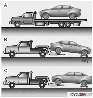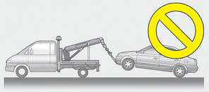 Если какое-либо из нагруженных колес или подвеска компоненты повреждены или автомобиль буксируется с помощью передние колеса на земле, используйте буксировочная тележка под передние колеса. При буксировке коммерческим эвакуатора и колесных тележек нет используется, передняя часть автомобиля должна всегда быть поднятым, а не сзади.