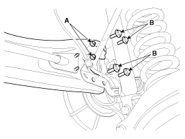 болты крепления продольного рычага (B), а затем снимите продольный рычаг с