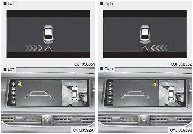 Если автомобиль, обнаруженный задними угловыми радарными датчиками, приближается с задней левой/правой стороны вашего автомобиля, прозвучит предупредительный звуковой сигнал, сигнальная лампа на наружном зеркале заднего вида начнет мигать, и появится сообщение появляются на ЖК-дисплее или экране информационно-развлекательной системы. Если вид сзади система мониторинга активирована, сообщение также появится на Экран информационно-развлекательной системы.