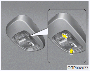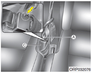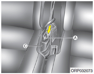 2. Чтобы втянуть задний центральный ремень безопасности, вставьте язычок, ключ или аналогичный предмет. небольшое жесткое устройство в отверстие для освобождения полотна (C). Потяните вверх ленту ремня безопасности (A) и позвольте лямке автоматически втягиваться.