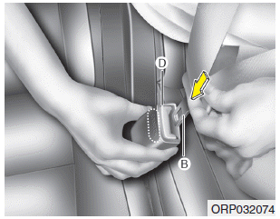 1. Нажмите кнопку фиксатора на пряжке (D) и снимите язычок (B). от пряжки (D).