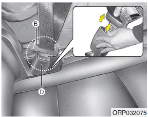 3. Потяните язычок (B) и вставьте язычок (B) в открытый конец. пряжки (D), пока не раздастся щелчок, указывающий на то, что защелка заперта. Убедитесь, что ремень не перекручен.