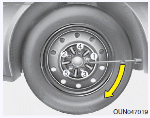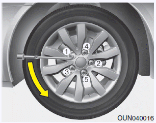 Затем расположите ключ, как показано на рисунке, и затяните колесные гайки. Убедитесь, что гнездо полностью село на гайку. Не вставайте на ключ ручку или используйте удлинительную трубку на рукоятке ключа. Обойти затяжку колеса каждую вторую гайку, пока все они не будут затянуты. Затем дважды проверьте затяжку каждой гайки. После замены колес мы рекомендуем проверить систему в авторизованном сервисном центре. Дилер Киа.