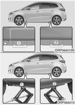 7. Поместите домкрат в переднее (1) или заднее (2) положение домкрата, ближайшее к шину вы меняете. Установите домкрат в предусмотренных местах под рамой. Позиции домкрата представляют собой пластины, приваренные к раме с двумя выступами и выступом. точка для индексации с домкратом.