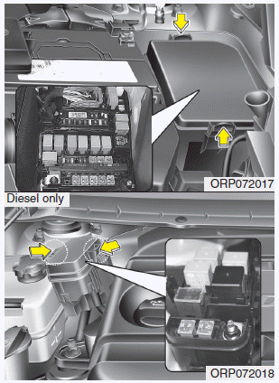 После проверки блока предохранителей в моторном отсеке надежно установите крышка блока предохранителей. В противном случае могут произойти сбои в электроснабжении из-за просачивания воды.