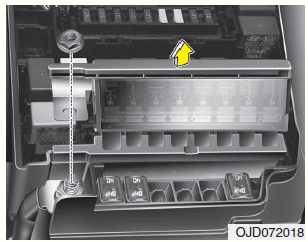 2. Снимите крышку панели предохранителей, нажав на выступ и потянув крышку вверх. Когда предохранитель ножевого типа отключен, извлеките его с помощью зажима, предназначенного для замена предохранителей, расположенных в блоке предохранителей моторного отсека. После снятия надежно вставьте запасной предохранитель равного количества.