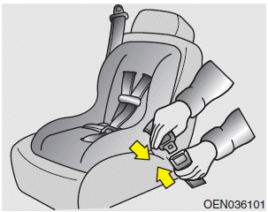 3. Пристегните ремень безопасности и дайте ремню безопасности компенсировать провисание. После установки системы безопасности для детей, попробуйте сдвинуть ее во всех направлениях, чтобы убедиться, что ребенок удерживающая система надежно установлена.