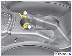 Чтобы отпустить стояночный тормоз, сначала включите ножной тормоз и поднимите стояночный тормоз. рычаг тормоза слегка. Во-вторых, нажмите кнопку разблокировки (1) и опустите парковочное рычаг тормоза (2), удерживая нажатой кнопку.