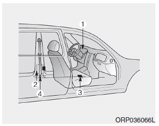 Система преднатяжителей ремней безопасности состоит в основном из следующих компонентов. Их расположение показано на рисунке: