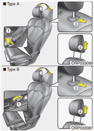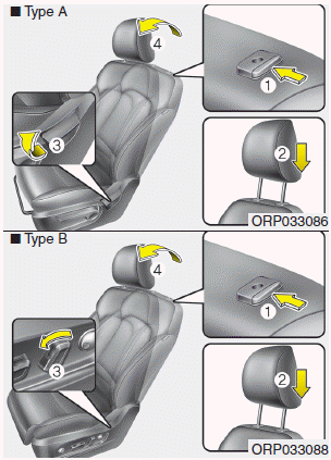 3. Нажмите кнопку фиксатора подголовника (3), потянув подголовник вверх (4).