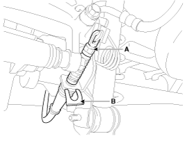 Снимите трос стояночного тормоза (А), предварительно сняв зажим (В).