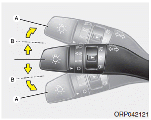 Чтобы сигнализировать об изменении полосы движения, слегка переместите рычаг указателя поворота и удерживайте его в этом положении. (Б). Рычаг вернется в положение OFF, если его отпустить.