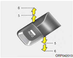 Кратковременное нажатие или поднятие переключателя электрического стеклоподъемника до второго фиксатора положение (6) полностью опускает или поднимает окно, даже если переключатель отпущен. Чтобы остановить окно в нужном положении во время работы, потяните вверх или нажмите вниз и отпустите переключатель.