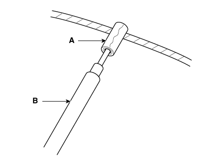 Включите радио. Измерьте напряжение между выводом 2 жгута антенного фидера кабель (A) и заземление кузова (B).