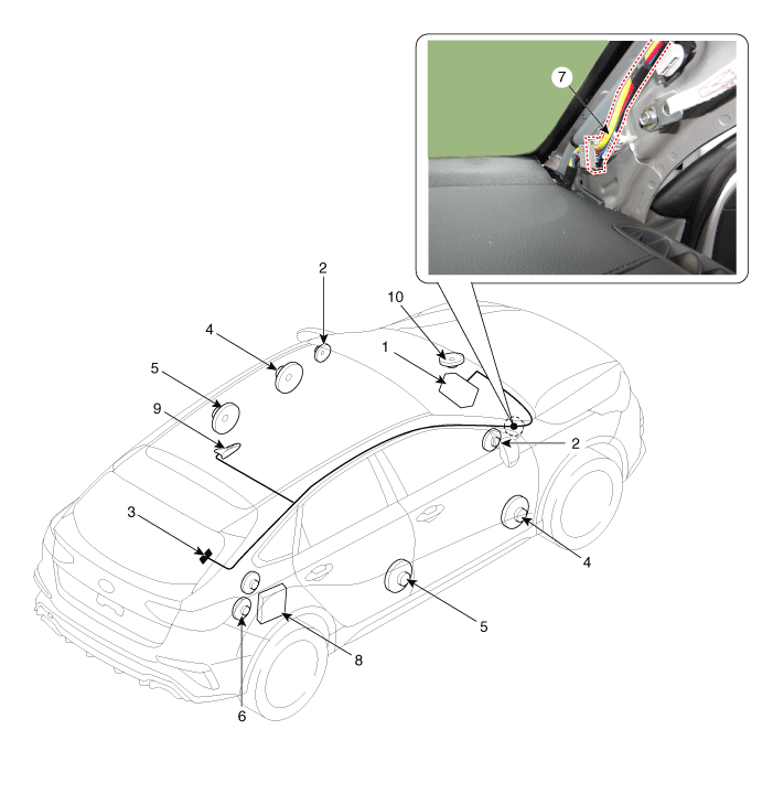 2. Динамик твитера 3. Стеклянный антенный усилитель 4. Динамик в передней двери 5. Динамик в задней двери |