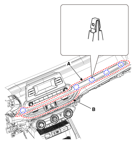 Снимите центральный вентиляционный канал в сборе (B) после снятия защитного кожуха. украшение в центре подушечки (A).