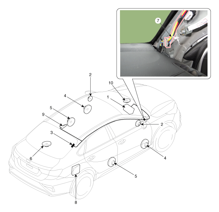 2. Передний высокочастотный динамик 3. Стеклянный антенный усилитель 4. Динамик в передней двери 5. Динамик в задней двери |