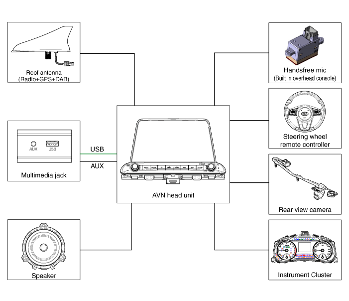 Система в основном состоит из клавиатуры для работы комбинированного функция, ЖК-монитор, головное устройство с громкой связью Bluetooth, распознавание голоса и навигация, музыкальный усилитель и медиа-блок, который подключается к другим внешним устройства.