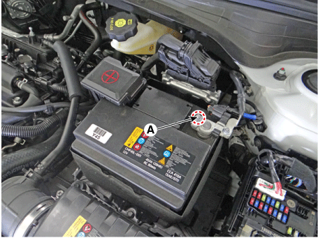 Отсоедините отрицательную (-) клемму (А) аккумуляторной батареи.