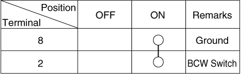 Включите переключатель BCW, затем проверьте целостность цепи между клеммами и Разъем переключателя BCW.