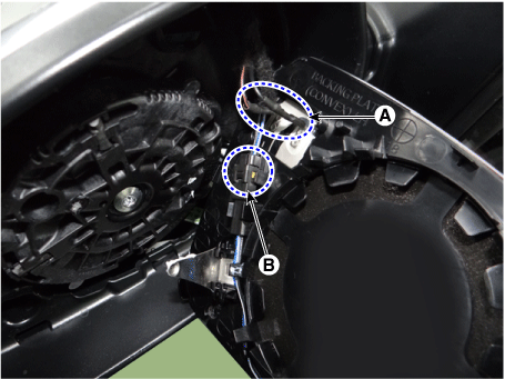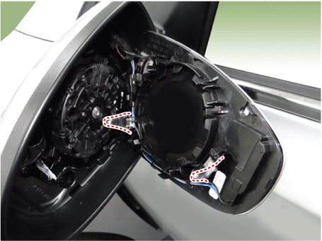 Отсоедините разъемы отопителя (A) и разъем индикатора BCW (B). из зеркала.