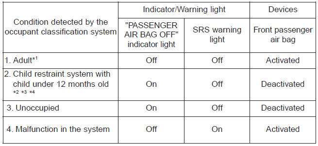 ПОДУШКА БЕЗОПАСНОСТИ ПАССАЖИРА ВЫКЛЮЧЕНА индикатор загорается примерно на 4 секунды после запуска/остановки двигателя кнопка повернута в положение ON или после запуска двигателя. Если переднее пассажирское сиденье занято, тогда датчик обнаружения присутствия классифицировать переднего пассажира после еще несколько секунд.
