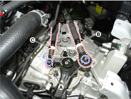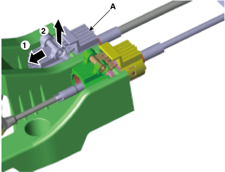 Снимите фиксатор троса переключения передач (А) после ослабления гаек (В). Затем, снимите трос переключения передач, потянув его в сторону салона автомобиля.