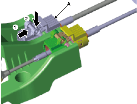 Установите фиксатор троса переключения передач (А), затянув гайки (В).