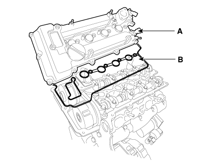Снимите крышку головки блока цилиндров (А), прокладку (В).