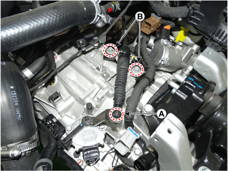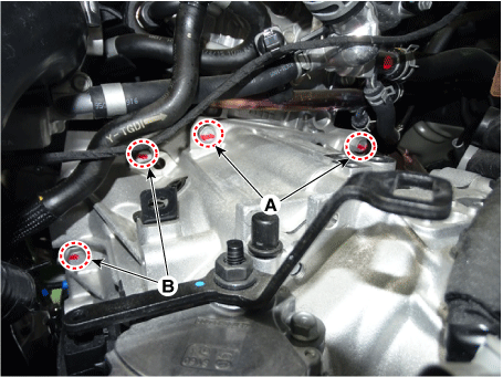 Ослабьте болты верхнего крепления коробки передач (А) и крепления стартера. болты (В).