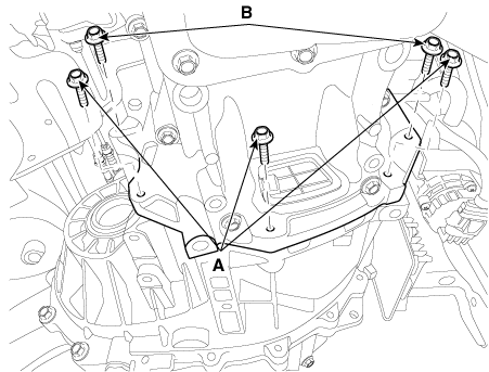 Ослабьте болты нижнего крепления коробки передач (А, В).