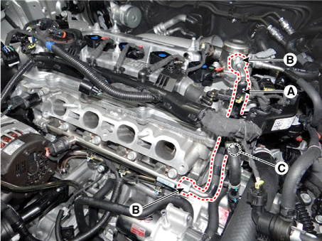 Снимите топливную трубку высокого давления (А) после ослабления крепления топливопровода высокого давления. гайки фланца топливопровода (B) и болт крепления функционального блока (C).