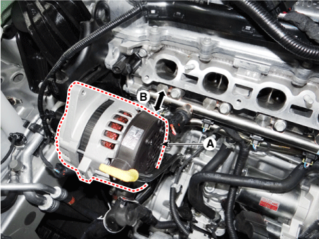 Сделайте зазор (В) между генератором (А) и двигателем в сборе, потянув генератор в направлении, указанном стрелкой.