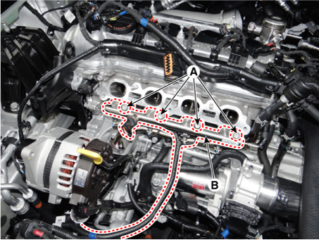 Снимите напорную трубу и инжектор в сборе (B) после ослабления крепежный болт (А).