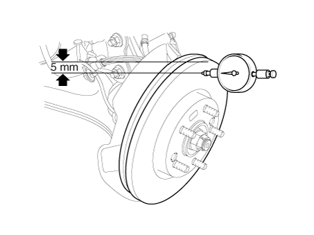 Поместите циферблатный индикатор примерно в 5 мм (0,2 дюйма) от внешней окружности тормозной диск и измерьте биение диска.
