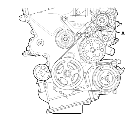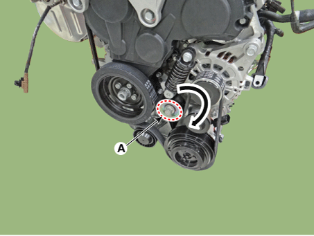 С помощью гаечного ключа поверните шкив автоматического натяжителя (А) против часовой стрелки. затем снимите приводной ремень (В).