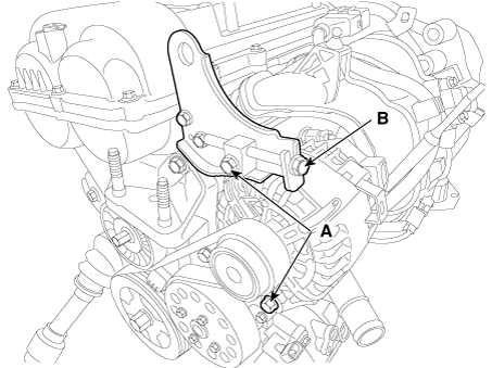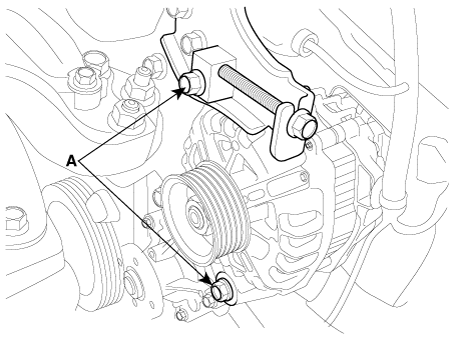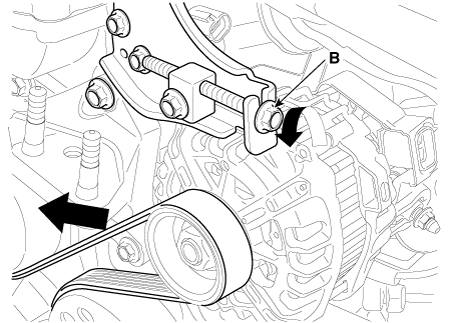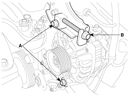 Ослабьте болты крепления генератора (А) и поверните регулировочный болт (B) против часовой стрелки, чтобы ослабить натяжение приводного ремня.