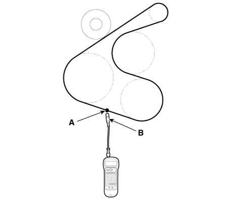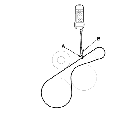 Найдите микрофон (B) близко к центру пролета ремня (A) и подпрыгните. ремень пальцем 2-3 раза. Прочитайте значение на дисплее. [С кондиционером]