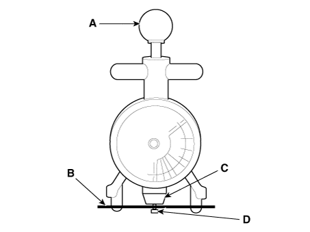 Нажимая на ручку (А) манометра, вставьте ремень (В) между шкив и шкив (или натяжной ролик) в зазор между шпинделем (C) и крюком (D).