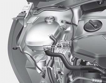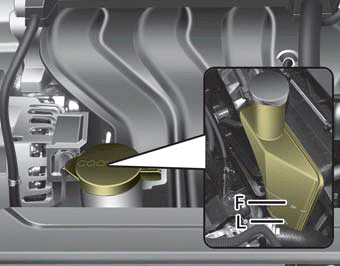 Уровень охлаждающей жидкости должен быть заполнен между метками F и L сбоку бачка охлаждающей жидкости, когда двигатель крутой.