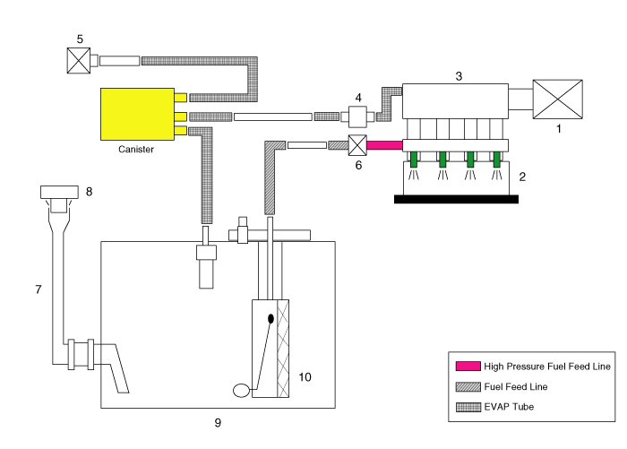 2. Напорная труба и инжектор 3. Двигатель 4. Электромагнитный клапан управления продувкой (PCSV) 5. Воздушный фильтр топливного бака |