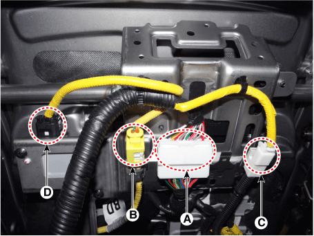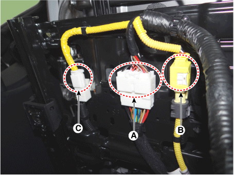 Отсоедините главный разъем (А), разъем замка переднего ремня безопасности (С), разъем подушки безопасности (B), разъем напоминания о ремне безопасности (D). [Драйвер]