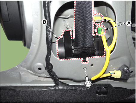 Отсоедините разъем (А) и снимите натяжитель ремня безопасности переднего сиденья. (B) после ослабления крепежного болта.