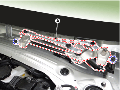 Снимите двигатель стеклоочистителя и рычажный механизм (А) после ослабления крепления. болты.